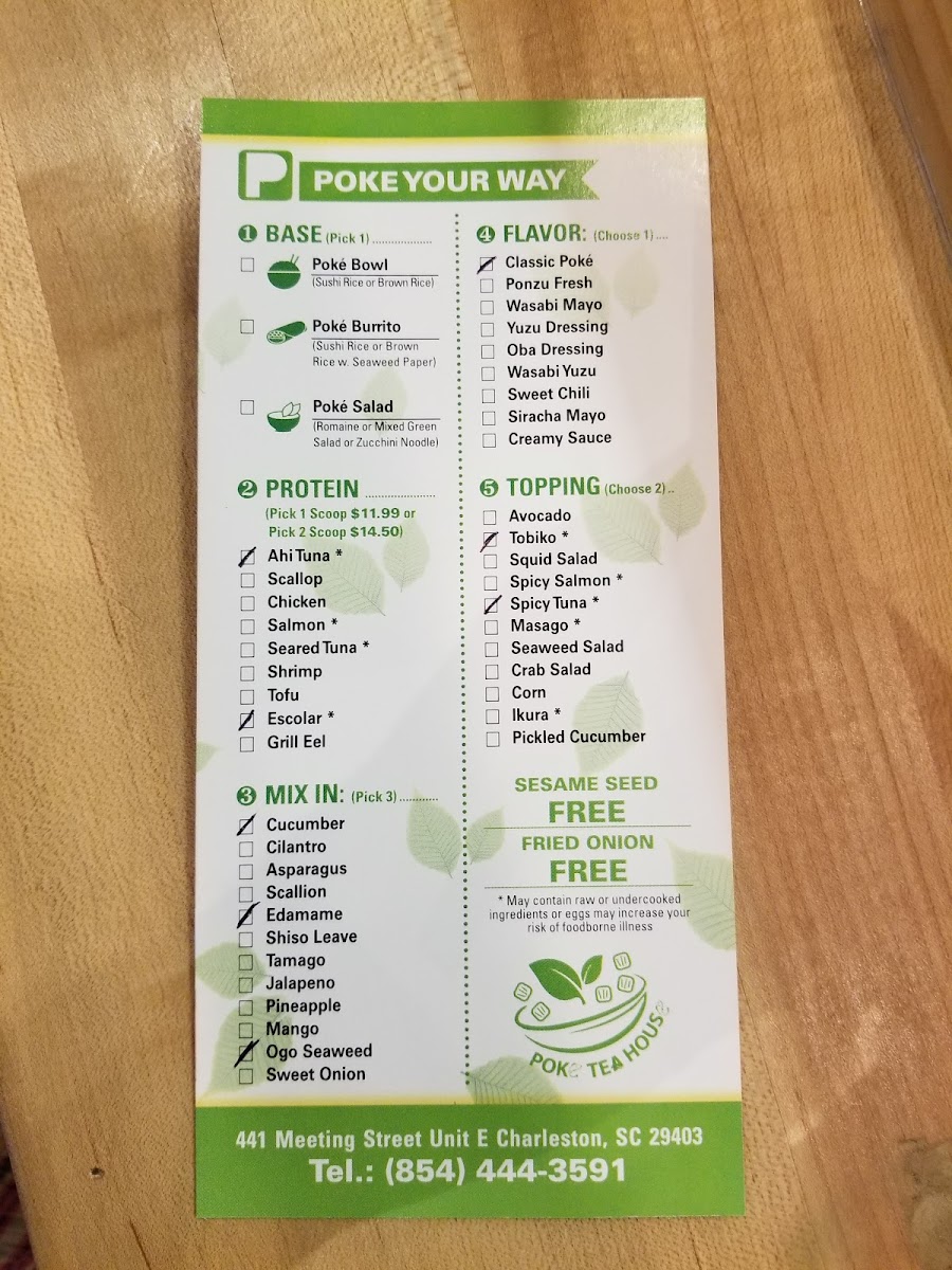 At Poke Tea House, the menu offers a delightful array of fresh, vibrant, and healthy options that perfectly capture the essence of Pacific Island flavors. Whether you're craving a customized poke bowl with all your favorite toppings or something unique from their selection of signature bowls, there's a perfect choice for every palate. The fusion of colorful ingredients like fresh fish, crisp veggies, and savory sauces comes together in a way that is both satisfying and nourishing. And let's not forget their range of refreshing teas, perfectly complementing the light and flavorful bowls. With its convenient location at 441 Meeting Street, Poke Tea House is the perfect spot for anyone seeking a quick, delicious, and wholesome meal. The menu is simple yet full of possibilities, inviting you to create a bowl that's as unique as your taste buds.